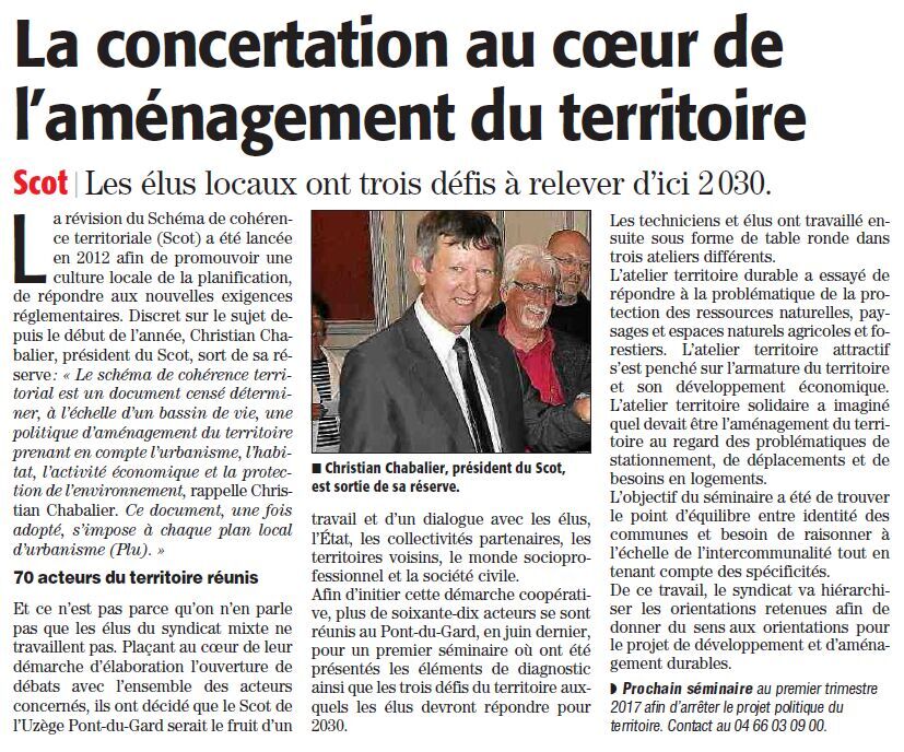 Répondant à l’invitation de Christian Chabalier, deux membres de CITRE ont pris part le 20 Juin à la démarche participative du SCoT pour l’élaboration du projet d’aménagement et de développement du territoire Uzège Pont du Gard.