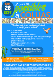 Marche pacifique et festive sur les boulevards d’Uzès. Soyons les plus nombreux possibles pour affirmer notre exigence d’un changement radical de système et soutenir toutes les initiatives qui vont dans le sens de la transition écologique, individus, élus associatifs et politiques. Rendez-vous sur la place aux herbes. - Samedi 28 septembre – 10h jusqu’au bout de la nuit : Fête des possibles à Collias