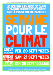 A l’appel de plus de 60 organisations et associations écologistes, Uzès Unis pour le climat organise une semaine pour le climat du 20 au 28 septembre 2019. Mobilisons nous pour mettre en cause ce système qui détruit la planète et l’humain et prendre le virage de la transition écologique en participant à la SEMAINE POUR LE CLIMAT.